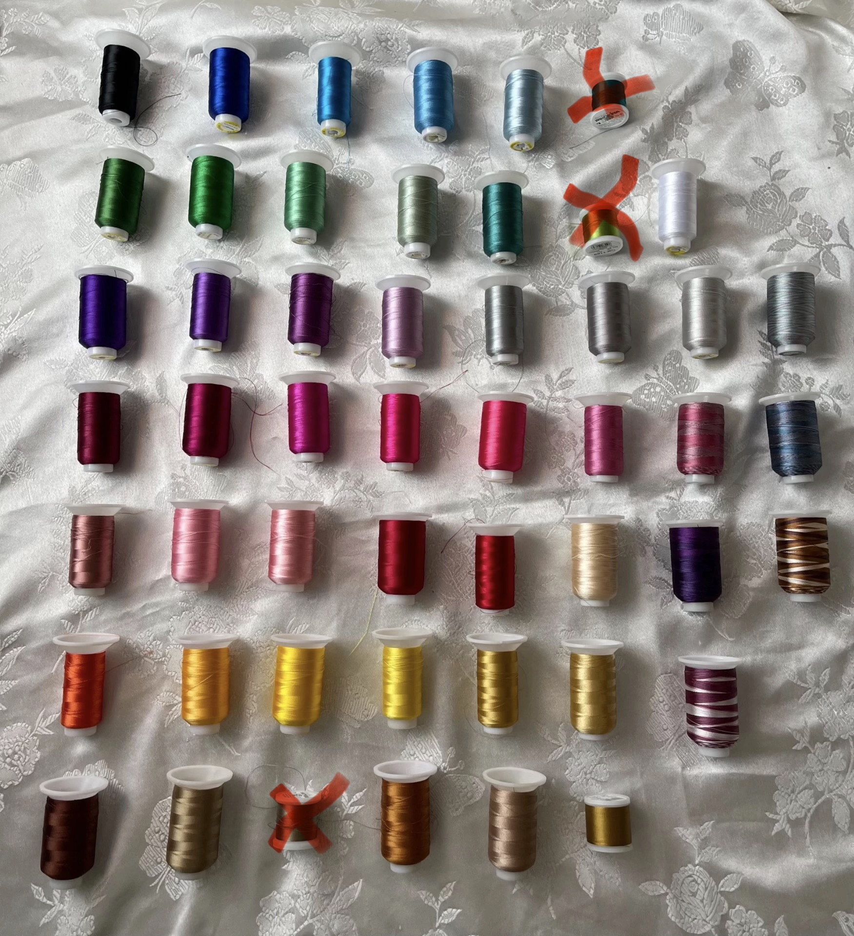 1. svart, 2. kongeblå, 3. turkis, 4. ocean blue, 5. skyblue, 6. tom, 7. safari green, 8. grønn, 9. medium mint, 10. lys mint, 11. ocean green, 12. tom, 13. hvit, 14. dark purple, 15. mulberry, 16. ametyst, 17. dark tulip/lavendel, 18. sølvgrå, 19. mørk grå, 20. lys grå, 21. tuttifrutti, 22. burgunder, 23. mørk fuchsia, 24. deep passion, 25. fuchsia, 26. bringebær, 27. medium plum, 28. flerfarget rosa, 29. flerfarget blå, 30. salmon, 31. strawberry, 32. lys rosa, 33. mørk rød, 34. rød, 35. krem, 36. flerfarget lilla, 37. flerfarget brun, 38. orange, 39. okergul, 40. deep lemon, 41. sunburst, 42. gull, 43. lys gull, 44. flerfarget burgunder, 45. mørk brun. 46. mocca, 47. tom. 48.kobber, 49. iced mocca, 50. mørk gull 51. neongrønn