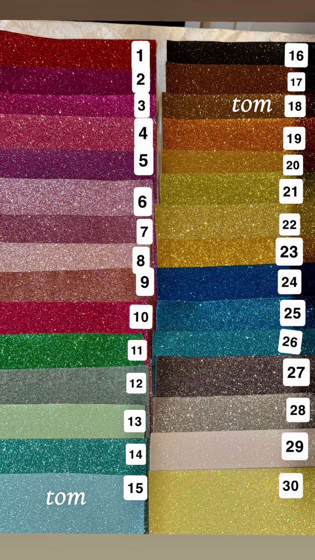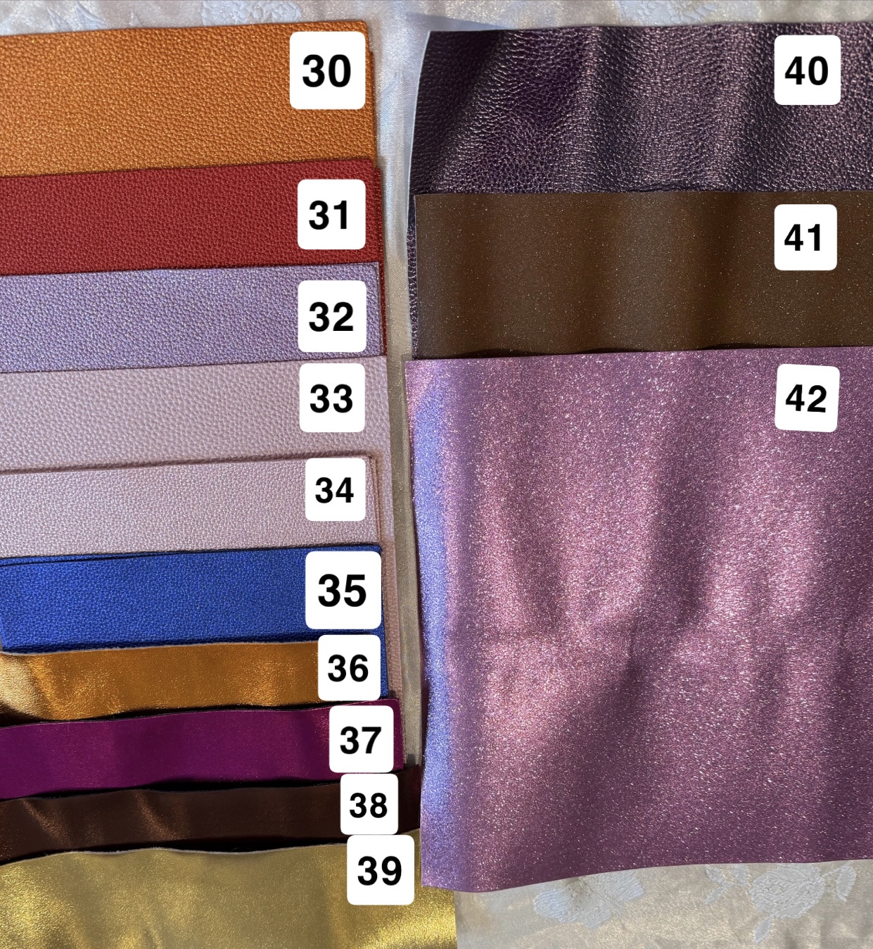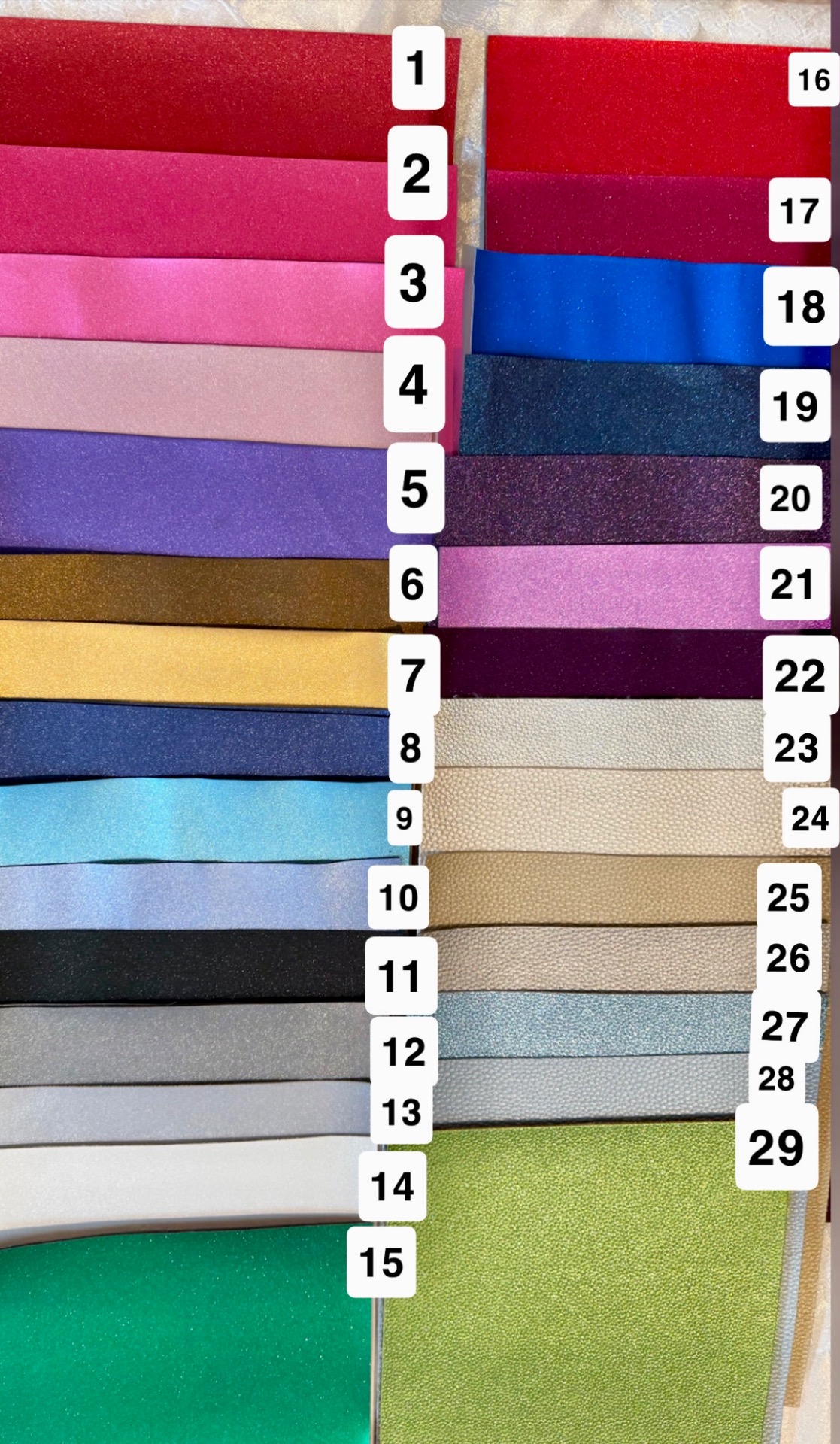 gull, 5: gul med gull, 6: sølv glitter, 7: svart, 8: kongeblå, 9: petrol, 10: babyblå, 11: brun skinnimitasjon 12: grønn 13: mint, 14: rød 15: neonrosa 16: lys rosa 17: lilla, 18: plomme 19: burgunder, 20. orange 21: gul, 22: sand, , 23: mørk brun 24: brun 25: lys brun 26: sennepsgul, 27: bronse/kobber 28: sølv 29: gull 30: refleks