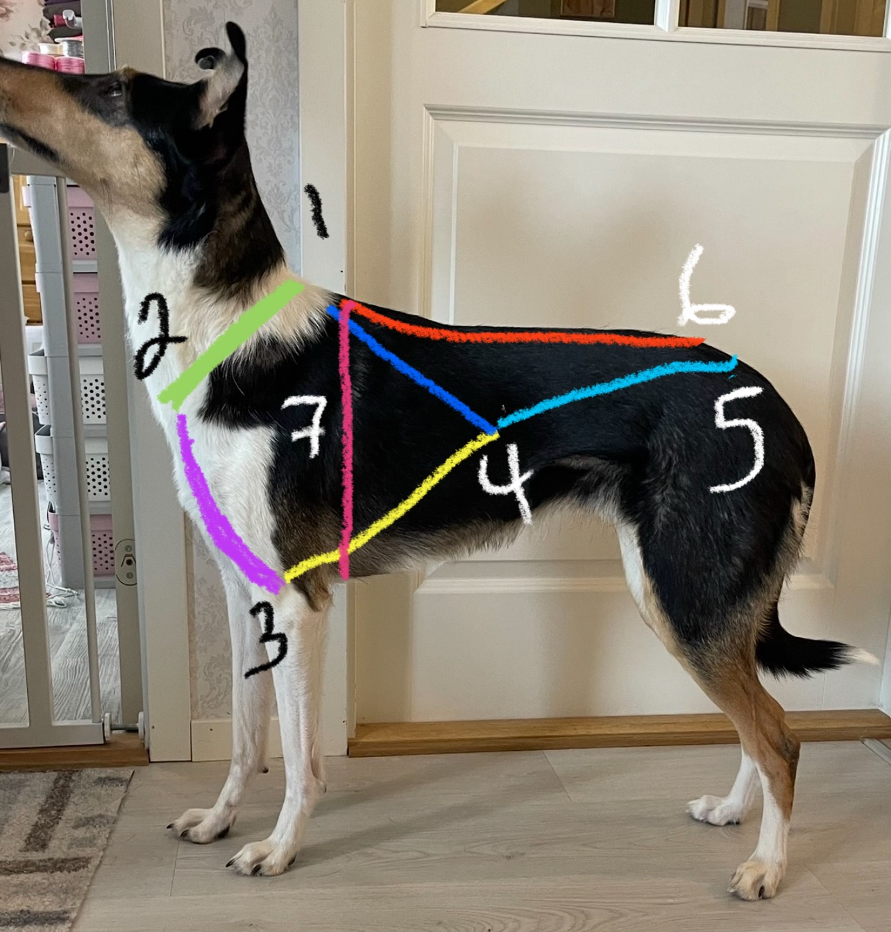 2-3: Fra der mål 2 slutter på brystet, mellom frambeina og til et lite stykke bak frambeina. Mål dit du ønsker at reima på selen skal gå. Punkt 4 oppe på ryggen og punkt 3 skal være på samme linje.